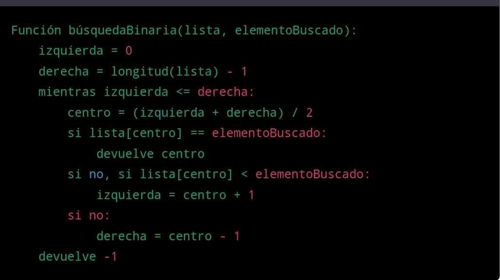 A continuación, se presenta un ejemplo de pseudocódigo que implementa el algoritmo de búsqueda binaria: